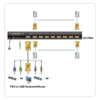 - 31 adet ATEN-CS1708A Switch'in zincirleme bağlantı yöntemi ile birbirine bağlanmasıyla 256 adede kadar PC kontrol etmek mümkündür.